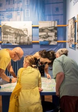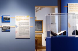 From a large-format projected slideshow with insights into the museum's extensive collection, to biographies with explanatory illustrations and an audio station, to an interactive map table on which visitors can plot their own school journey, there are various approaches and levels for immersing yourself in the school history and stories.