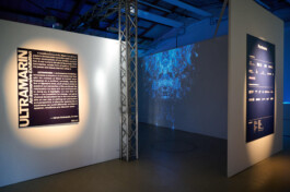 At the beginning of the exhibition, a large-format projection creates an immersive spatial atmosphere. This is followed by the defining spatial design elements consisting of hanging cylinders made of a blue translucent fabric, which are reminiscent of jellyfish in the sea in the deep blue illuminated space. In addition to their artistic setting, the cylinders also serve as a boundary for the VR works.