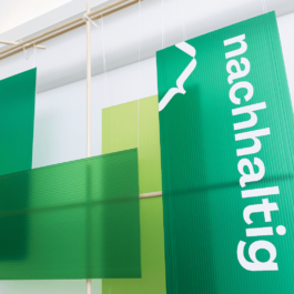 Die drei Themenbereiche NACHHALTIG, SOZIAL und DIGITAL werden in jeweils passende Farbspektren übersetzt. Mittels eines modularen und wiederverwendbaren Systems aus Rundhölzern und farbigen Hohlkammerplatten werden thematische Räume erzeugt und mit unterschiedlichen Soft Sculptures ergänzt. In Räumen der Begegnung und des Austauschs überlagern sich die Farbspektren.