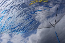 the MIRROR reacts to the existing situation on site and transforms disruptive motorway noise and constantly prevailing wind into an acoustic and visual wind chime. A filigree mesh structure stretches over the existing seating and the green area next to it, creating a feeling of calm and security without blocking the view into the distance. Light, coloured stripes move gently in the wind and invite residents to linger and listen.